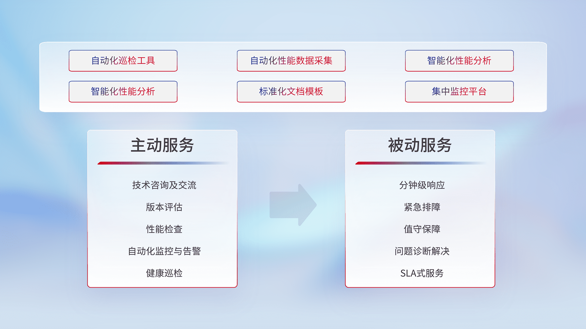 智能化工具和标准化文档,,保障服务质量,,,,提供主动服务(包含技术咨询、、、、版本评估、、、性能检查、、自动化监控与告警、、、、健康巡检)和被动服务包含(分钟级响应、、、、紧急排障、、、值守保障、、、、问题诊断解决、、、、SLA服务)。。。。